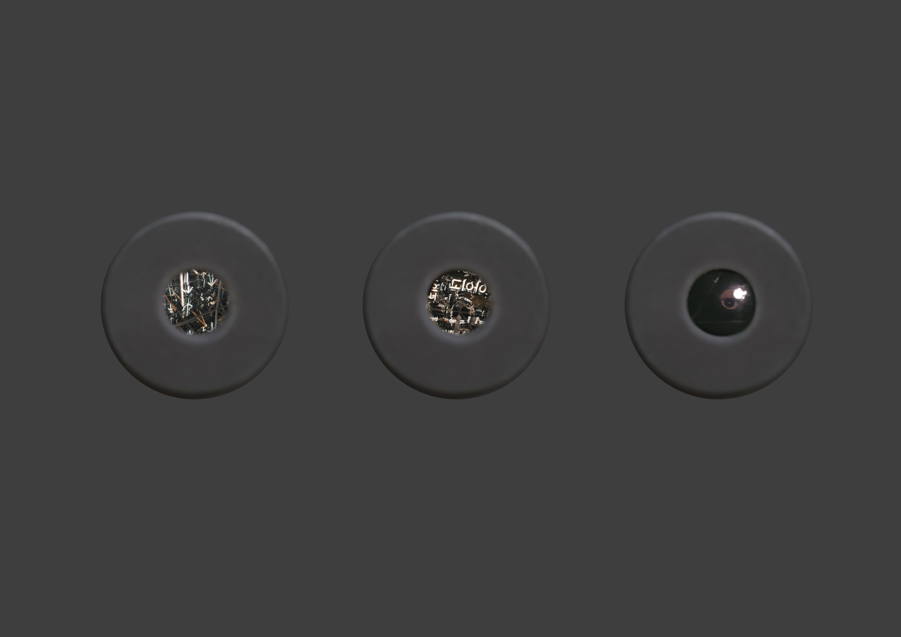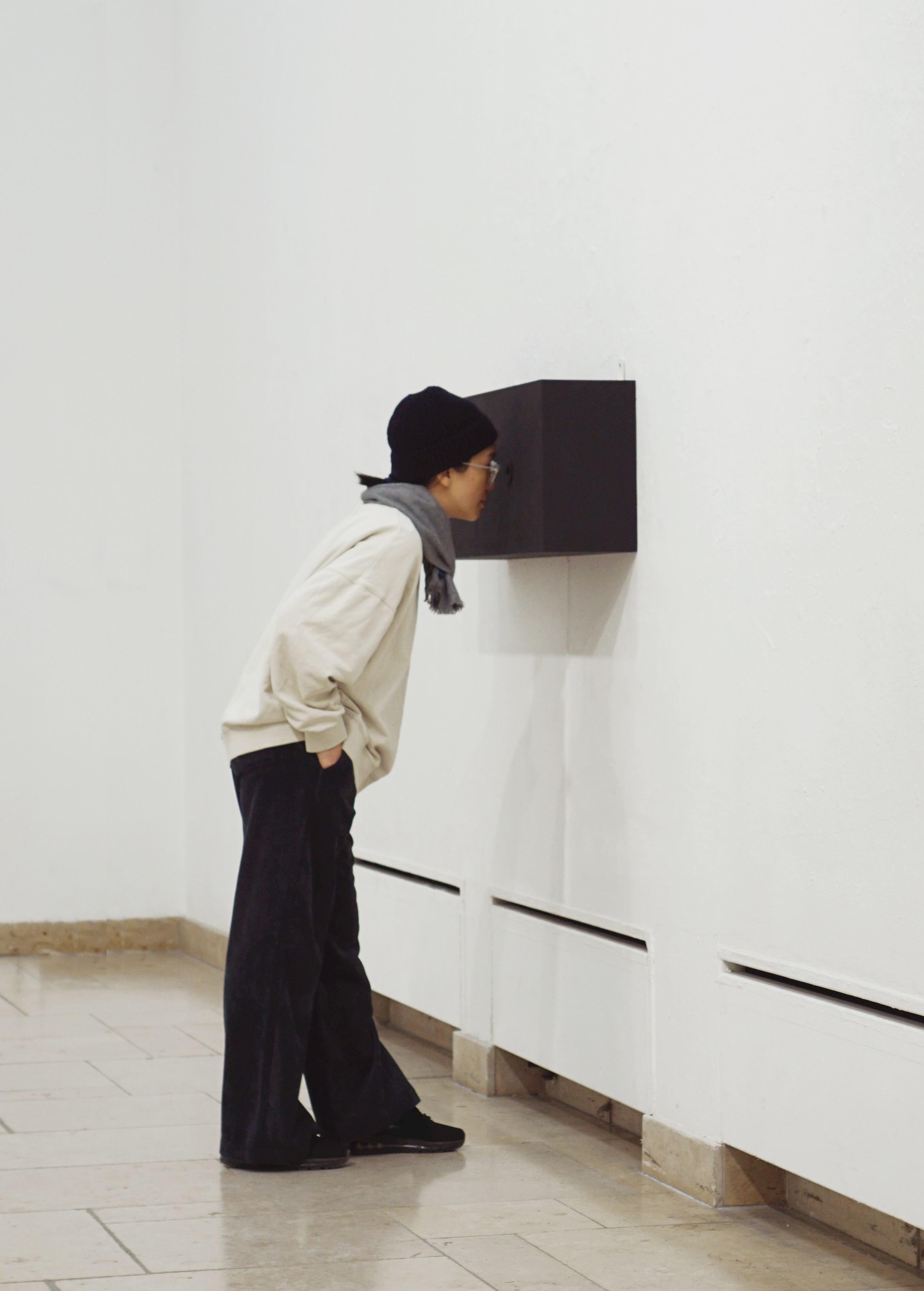 A black wooden box has three holes, and when someone looks into each one, a different space unfolds inside.